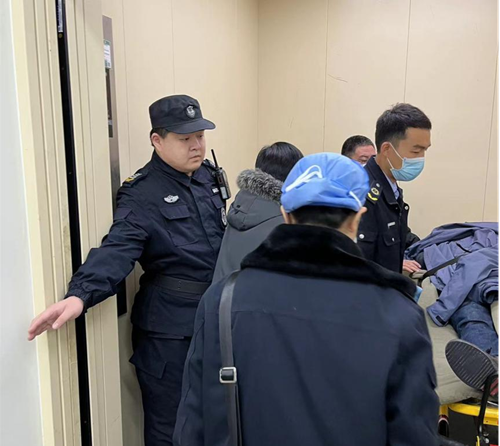 當(dāng)天上午,正在政務(wù)中心南門執(zhí)勤的保安員周彪和婁前松,發(fā)現(xiàn)一輛120救護車駛來,兩人便上前詢問情況,在得知六樓食堂有人突發(fā)心臟病后,第一時間將情況上報給了分隊長呂偉,呂偉得知情況后,考慮到救援人員攜帶擔(dān)架和急救設(shè)備等特殊情況,他迅速反應(yīng),指示周彪快速引導(dǎo)救援人員走距離最近的貨梯上樓,同時管控該貨梯此段時間使用。說話間,呂偉已經(jīng)同時趕到了事發(fā)地。